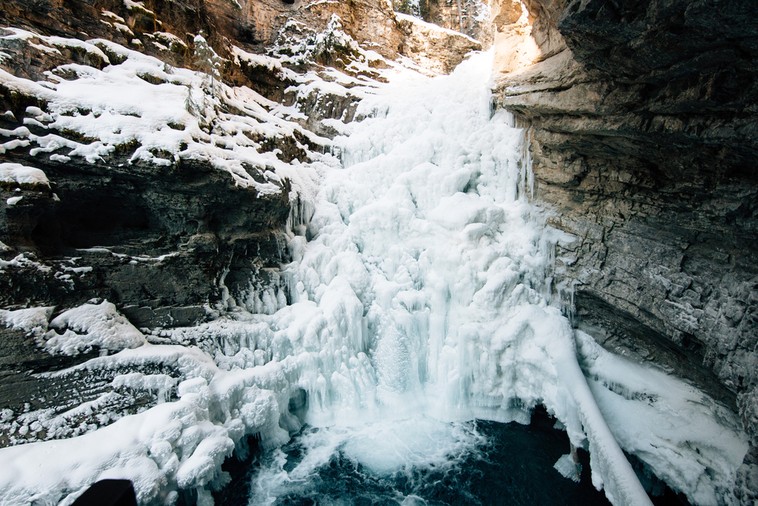 氷瀑で有名なジョンストン・キャニオンは、冬のバンフ観光のハイライトの一つです。遊歩道を歩いて約15分でロワー滝、さらに約45分でアッパー滝に到着できます。冬季は滝が氷結し、青白く輝く氷瀑の美しさは圧巻です。アイスクリートという専用の靴底金具を装着すれば安全にハイキングを楽しめます。