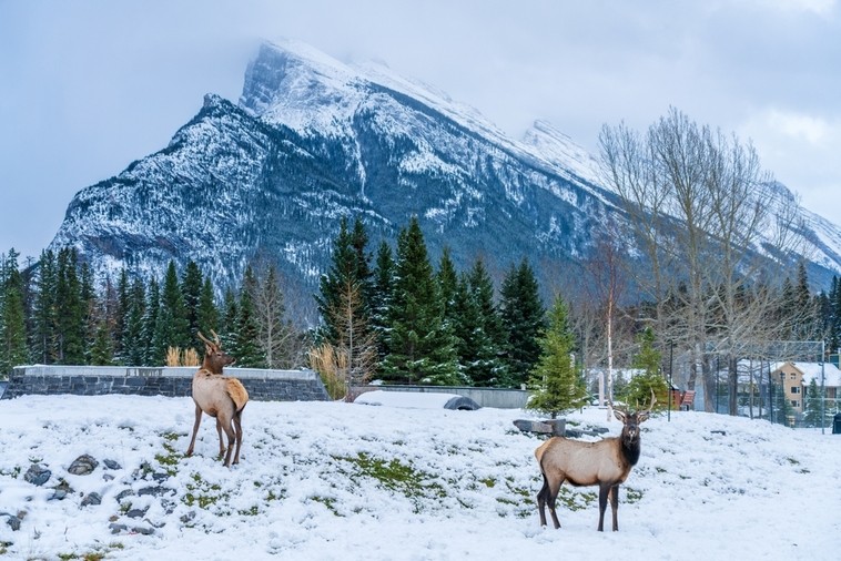 冬のバンフでは、雪景色を背景にしたエルクやビッグホーンシープ、時にはオオカミの観察チャンスがあります。特に早朝や夕方の時間帯に遭遇する可能性が高く、野生動物の生態を観察する貴重な機会となります。