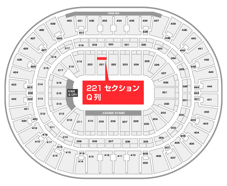 221セクション Q列:ジャッジ席の対面、Kiss&Cryもしっかり見える席となっています。