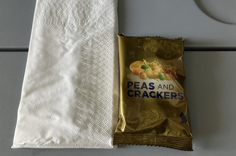 通常、離陸後約1時間ほど経った頃、ドリンクとスナックサービスが始まります。今回は気流が乱れている場所を長く飛行しなければならず、おしぼり・ドリンク・スナックサービスが全てなくなりました。参考までに、画像は帰りの機内で頂いたスナックです。ラーメンスナックのようなものや豆菓子、おかきがミックスされているもので、スパイシーな濃いめの味が美味しかったです!
