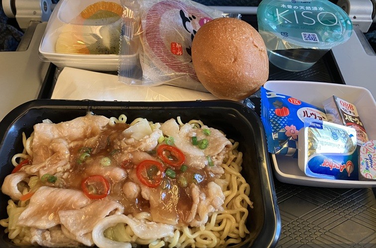 到着の2時間ほど前に、2回目の機内食が運ばれました。オムレツかポークで、筆者はポークをチョイス。こちらも美味しかったです、本当に。あんかけ焼きそばのような感じです。豚肉がたくさん入ったピリ辛のあん、これは日本人が好きな味だと思います。