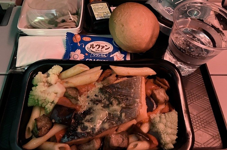 離陸して約2時間後、待ちに待った機内食の配布が始まりました!メインは牛焼肉またはサーモン。前回利用した際に牛丼が美味しかったので、牛焼肉にしよう♪すると、筆者の数列前で、担当CAがメイン料理と思われるパックを別のCAに手渡すこと数回。近づいてくると筆者の前列の方にsorryと謝っていらっしゃる。嫌な予感!聞き耳を立てていると、なんと牛焼肉が品切れ!!残念過ぎる!!筆者同行者共に自動的にサーモンとなりました。