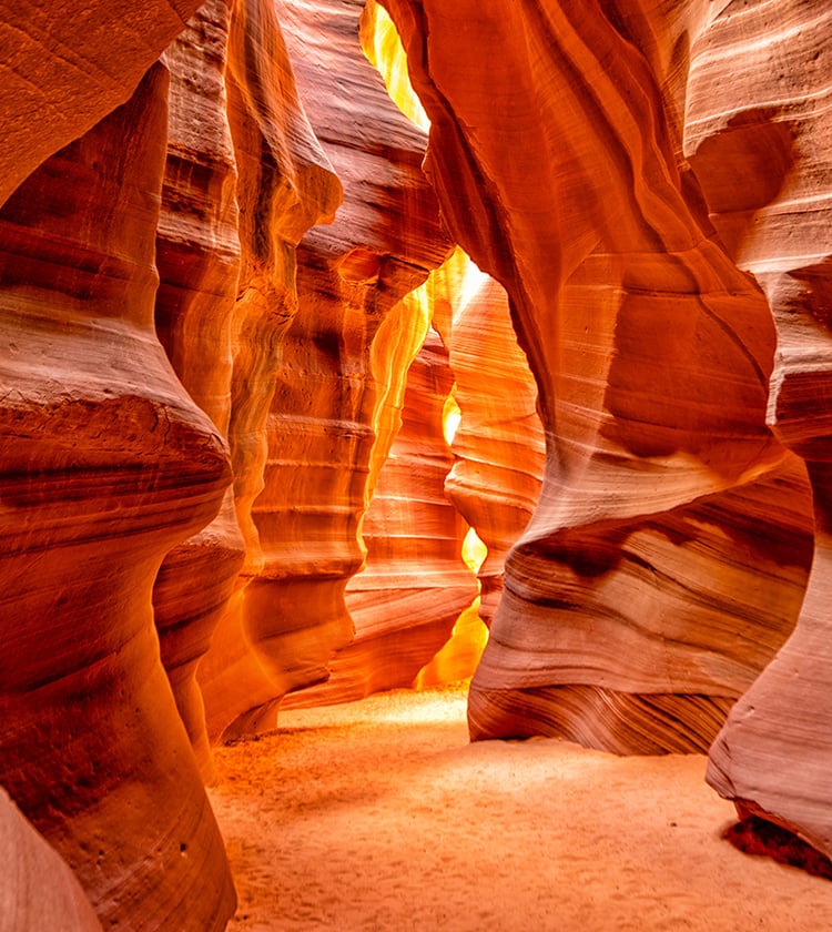 アリゾナ州ペイジ近郊、ナバホ族の居住地内にある渓谷。鉄砲水や風の浸食で造り上げらた大地がまるでうねりを上げているかのような姿は美しくも奇妙。自然保護の観点から人数制限を設けており、ナバホ族のガイド同行ツアーでなければ行くことができない特別感のあるスポットです。アッパー・アンテロープキャニオンに一定の時間だけ降り注ぐ光(ビーム)は観光の目玉。世界中の観光客を魅了する神秘の光景をご堪能ください。