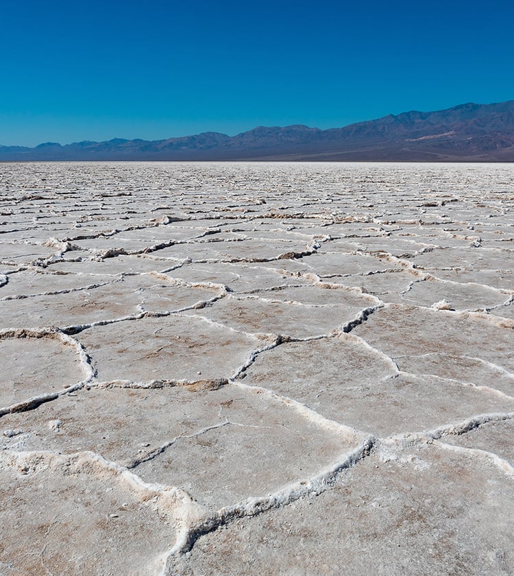 北米で最も低くく、海面下約86mの地点にあるバッドウォーター。かつては塩水湖であったため、飲料水に適さない悪い水=Bad Waterと名付けられました。現在は干上がり、周辺の山に降った雨が流れ込んでも乾燥気候のため水分は蒸発し、残された塩の結晶がこの絶景を生み出しています。デスバレー唯一の展望台「ダンテスビュー」から眺めれば、遠くの山々と真っ白な塩原のコントラストを楽しめます。