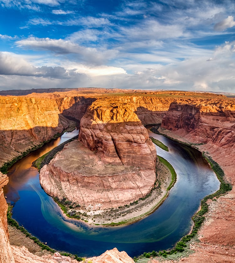 アリゾナ州ペイジ郊外にある絶景ポイント。「ホースシュー(Horseshoe) = 馬の蹄鉄、ベンド(Bend) =曲がり」という名前の通り、コロラド川がUの字を描くように大きく蛇行したダイナミックな景色を楽しめます。カーブのような不思議な形は、長い年月をかけコロラド川が崖の浸食を続けたことで形成されました。高さ300mの崖から見下ろすと格別の美しさがあり、自然の驚異を感じることができるでしょう。