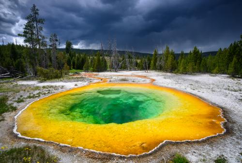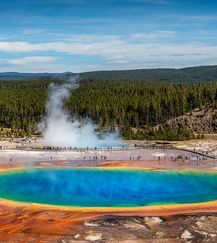 アメリカで最大、世界で第3位の規模を誇る熱水泉。直径約100m、深さ約50mの泉からは70℃の程の熱水が湧き出ています。その大きさもさることながら、虹色のように見える幻想的な色合いが最大の特徴。周囲のオレンジ色はバクテリアによるもので、中央の濃いブルーは太陽の光を浴びることで生み出されています。全体を写真に収めるには、近くにあるフェアリーフォールトレイルの展望台から見るのがおすすめです。
