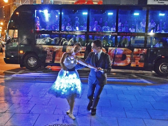 ガラス張りのバスに乗客全員が横向き(ガラス窓向き)に乗り込み、名所巡りへとバスはマンハッタンの街なかを走り出します。すると突然、道を歩いている人が歌い出したり、公園ではバレリーナが舞うなど、街なかにはパフォーマーが出没し、ゲリラ・パフォーマンスを楽しむことができます。まるで街全体が劇場になったような不思議な感覚になります。