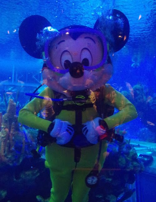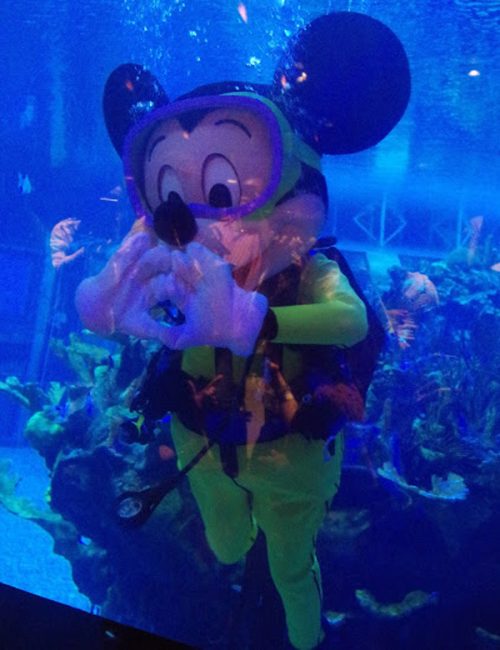 次は一番の目玉「ダイビングミッキー」の登場です!!2つのグループに分かれて水槽の前に見に行きます。今か今かと待っていると、ミッキーが登場!もう今後一生見ることができないであろう、超貴重な水の中のミッキーを目に焼き付けました!たっぷり15分間水槽内を泳いでくれたので写真撮影もばっちりでした。