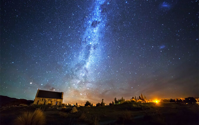 - サザンアルプス東側の高地に約30kmと広がるテカポ湖。テカポ湖周辺のエリアは、世界にたった4か所しか存在しない「ダークスカイ・リザーブ(星空保護区)」のひとつに認定されています。星が密集する南半球に位置していること、晴天率が高いこと、空気が澄んでいることなど、星空観賞の条件が揃っていることに加え、星空を大切に思う住人たちにより街の明かりが抑えられている素晴らしい観賞環境です。