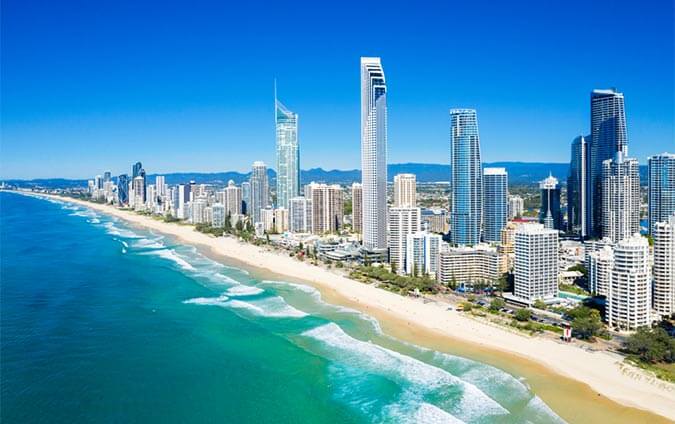 クイーンズランド州の都市「ゴールドコースト※」は、その名のとおり「金色に輝く海岸線」が70kmにもわたって続く、世界有数の晴天率の高いビーチリゾートです。ゴールドコースト観光の拠点であるサーファーズ・パラダイスの街では、マリンスポーツ・食事・ショッピングを楽しみ、街の周辺に足を延ばせば圧倒的な大自然にも出会える、オーストラリアの魅力が凝縮された人気都市です。