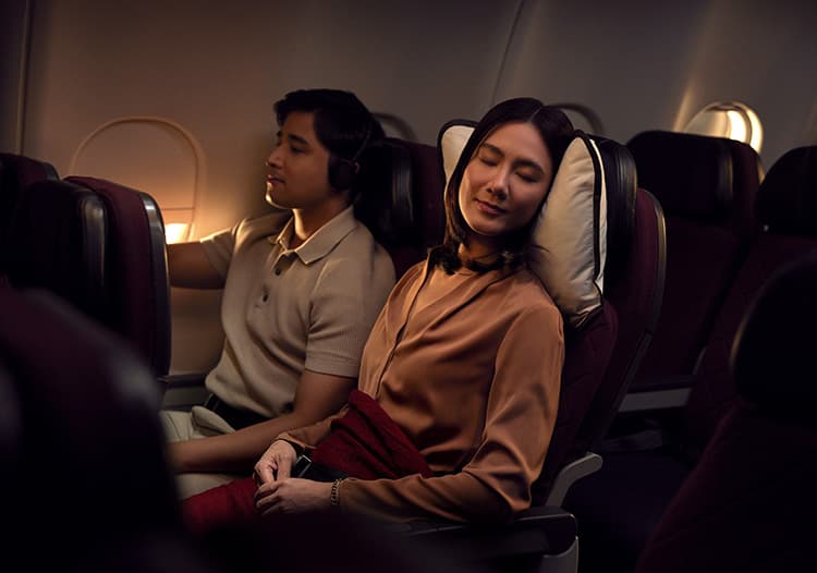 - 調整可能なヘッドレストと腰を守るランバーサポート付きのエコノミークラス(エアバス330-300)は全部で269席。フライト中は、最新のオンデマンド方式の機内エンターテインメントを無料でお楽しみいただけます。お食事は、選べる3種類のメインメニューをご用意しています。