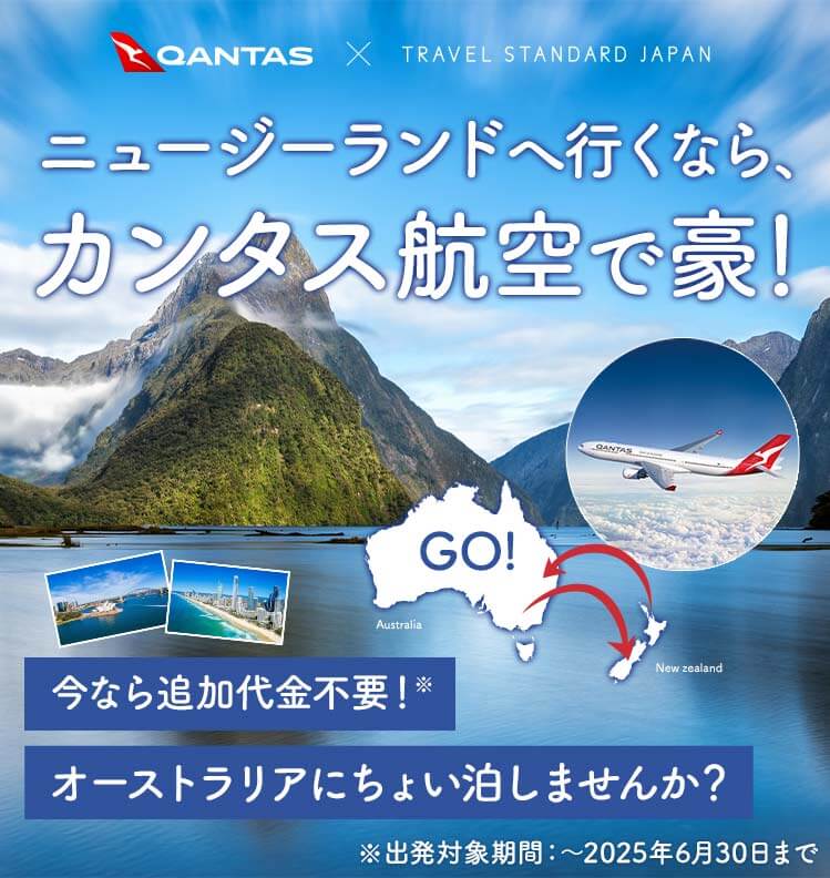 シドニー、ブリスベン、メルボルンのいずれかを経由してニュージーランドへ。カンタス航空なら、オーストラリア国内の乗り継ぎ地点での途中降機※、滞在ができるだけでなく、往路はオークランドに到着、復路はクライストチャーチから出発など、行きと帰りで異なる空港のご利用も可能!トラベル・スタンダード・ジャパンでは、ルート設計が難しい複数の国をまたぐ旅でも、最も効率的でお得な旅程をプランニングしてご提案。もっと自由にオーストラリア・ニュージーランドどちらも満喫する旅にでかけませんか?