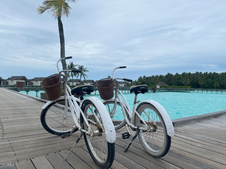 お部屋の鍵は水に濡れても大丈夫なシリコンリストバンドなので、シュノーケルにも手ぶらで行くことができてとっても便利でした!滞在中ずっと腕に付けていても気にならなかったです。また、各部屋には自分専用の自転車が置いてあり、いつでも自由に使うことができます。ブレーキは無く後ろに漕ぐと止まるタイプですが難しくなくすぐに運転には慣れました。島内のサイクリングは気持ちよくて最高でした!