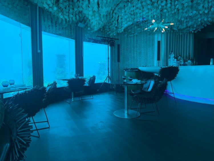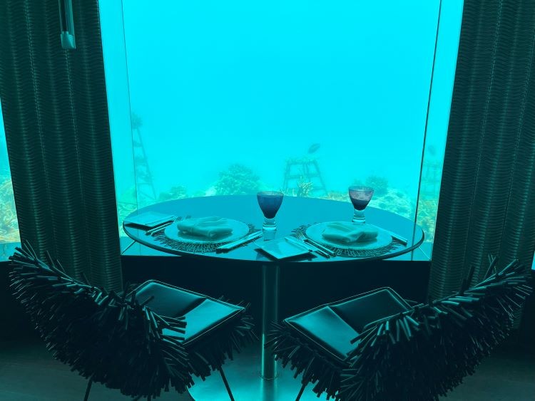 ドアを開けると大きなガラス張りの窓がひと際目立つ、素敵な空間が水深6Mに広がっていました。その綺麗な青とカラフルな魚たちに感動!レストランは全8席ですが、まだ他のお客様がいなかったのでたくさん写真を撮りました。