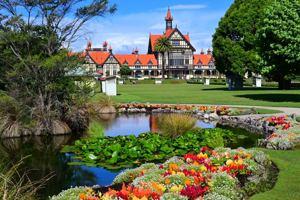 美しい庭園と歴史的建造物が魅力のガバメントガーデンでは、ロトルア博物館や温泉施設を見学しながら、散策を楽しめます。手入れの行き届いた花壇や芝生は、観光客に癒しの空間を提供します。