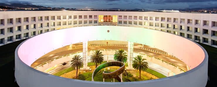 メキシコ・シティ国際空港の第2ターミナル内に直結するホテル「NH コレクション メキシコシティ エアポート T2」。鉄道駅や地下鉄駅が徒歩圏内で、観光にも便利なロケーションです。建物は中央部がくりぬかれた円形形のスタイリッシュなホテルで、ロビーから客室まで白を基調とした清潔感溢れる空間が広がっています。Wi-Fiはホテル全域で利用可能(無料)。