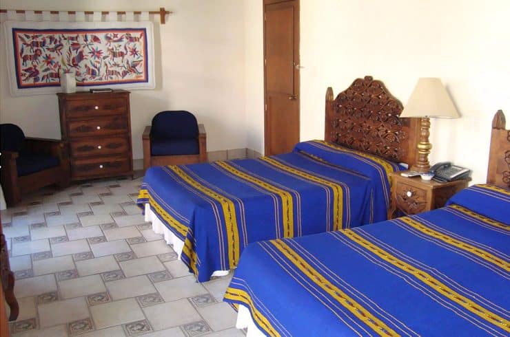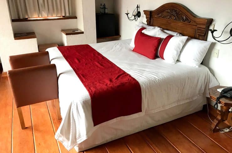 ナチュラルな客室は、広々としていて天井が高く快適。ベッドも大きく、のんびりと寛ぐことができます。客室によってはベランダがあり、通りや広場を眺めることが出来ます。バスルームはバスタブなしのシャワーのみ。2件あるレストランのうち1件は通りに面しておりテラスで食事を楽しめます。ディナーには、夜の広場を眺めながらマリアッチの生演奏を楽しめます。広場でも遅くまで音楽が奏でられているため、賑やかでメキシコらしさを存分に堪能できるホテルです。