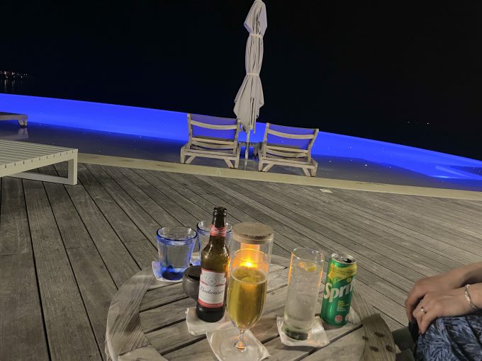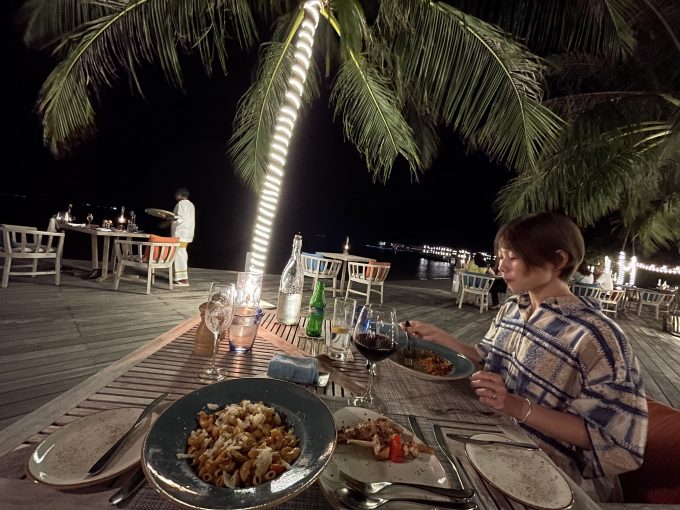 夜は再びカネリレストランへ。この日は地中海ビュッフェで、パスタや海鮮などすごく豪華でした。BBQのライブキッチンがあったり、大満足でした!夜のアウトサイド席は気持ちがよく、雰囲気も最高でした。帰り道、水上ヴィラ越しの星空観賞。過去最高と言っても過言ではないほど、素敵な光景・空間でした。
