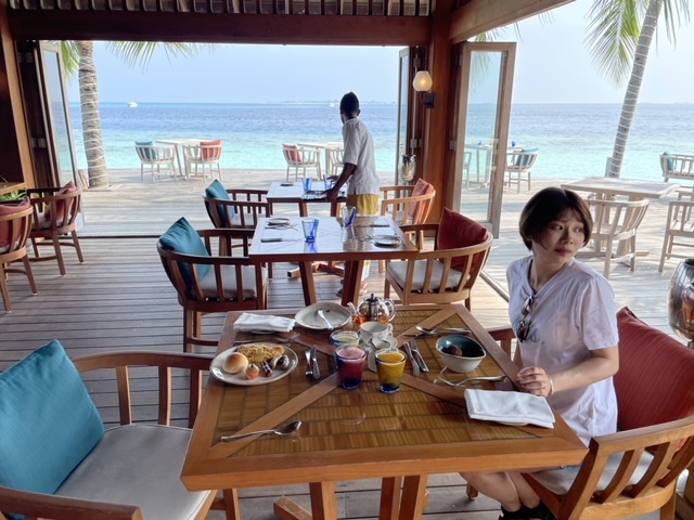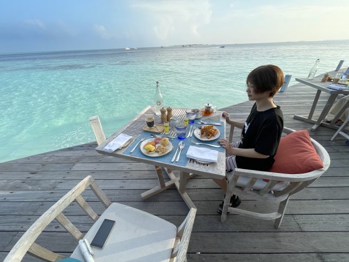 3日目は6時半に起床し、島から水上ヴィラに繋がる橋の所にウミガメやエイ、サメなど沢山の魚がいたので1時間ほど観察。ウミガメを近くで見れて奥さんが感動していました!その後は「カネリレストラン」でモーニング。インサイドの座席での食事でしたが、中からでも海が綺麗と十分にわかる開放的な絶好ロケーション。メニューは豊富なうえに、ライブキッチンがあったり、生搾りのオレンジやスイカのジュースを作ってくれたりと素敵なレストランでした!