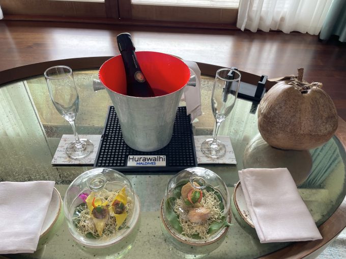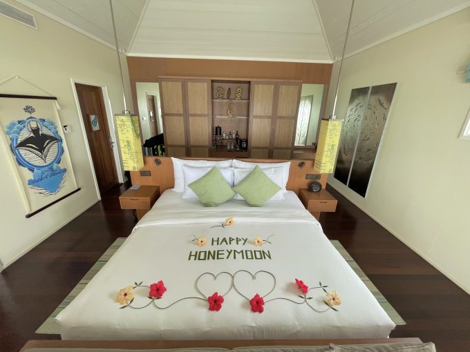 その後水上飛行機から高速フェリーに乗り継ぎ11時頃にラビヤニ環礁の「フラワリ アイランド リゾート」に到着。にチェックインの手続きをして、12時頃には憧れの水上ヴィラに入室しました。ベッドにハッピーハネムーンのとても可愛い飾り付けがあり、またシャンパンとおつまみが用意してあって、ハネムーン特典がうれしかったです!