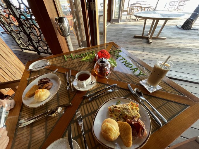 5日目も朝から橋でウミガメなどを観察してから、モーニングでカネリレストランへ。 この日は私の誕生日であったため、奥さんが私に内緒でホテルと連絡をとってくれていて、着席したテーブルにハッピーバースデーの文字が飾られていました。そのサプライズのお祝いを見つけたとき、とても幸せな気持ちになりました!