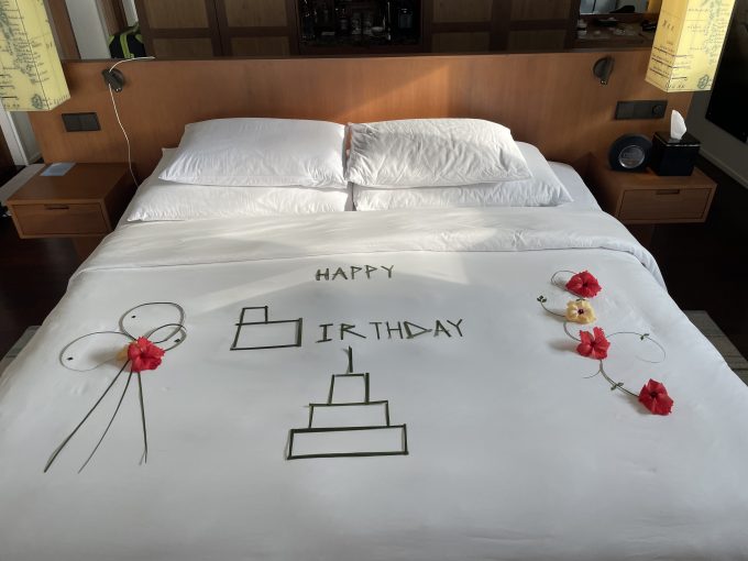 ヴィラに戻ると、今度はベッドの上にハッピーバースデーの飾り付けとバースデーケーキが用意してありました。本当に感動しました。ここまでしてくれるのは予想外だったので、本当に嬉しかったです。奥さんありがとう!!