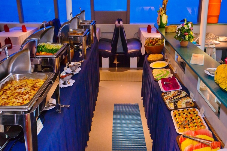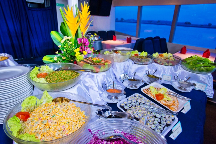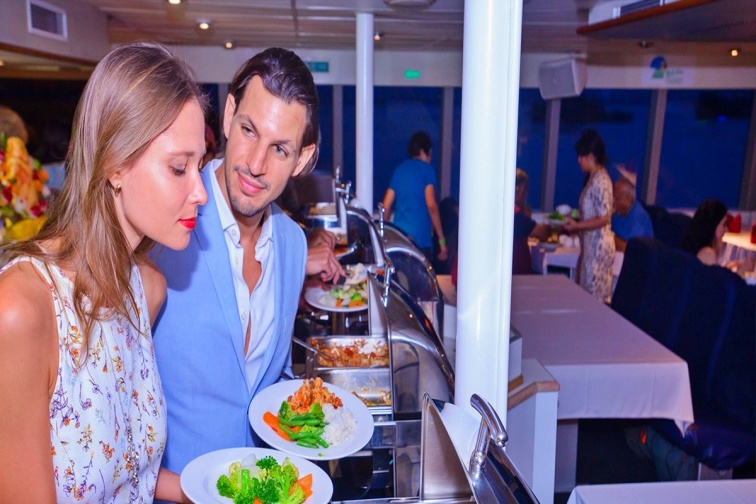 - メインデッキにてビュッフェをお楽しみください(インターナショナルバイキング)お食事は19:45、デザートは20:15まで。