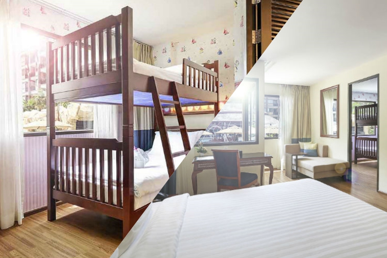 45m2のお部屋に大人2人と子ども3人まで泊まれるファミリールームは、小さいお子さま連れの旅行に最適のお部屋です。大人の寝室と子どもの寝室に分かれていて、のびのびと旅行中くつろぐことができます。お部屋からはプールが見えるので、とても涼しげな雰囲気になっています。