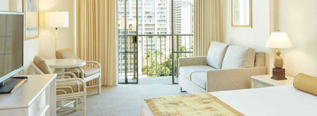 ベッドルーム、ラウンジ、キチネットが独立した、広々として快適なお部屋です。電気コンロ、冷蔵庫、食器、フォークやナイフ、スプーンがあるため、外食に飽きた方や、節約のために調理をする方にはとても便利な設備環境です。バルコニーからは、ビーチと、ワイキキの街並みを楽しむことができます。