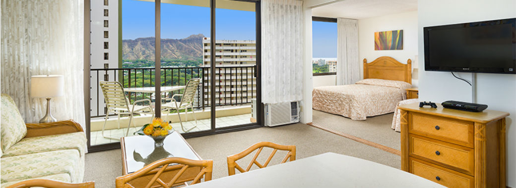 寝室とリビングはカーテンで仕切られているため、カーテンを開くと室内は開放的な空間が広がります。バルコニーからは、ダイヤモンドヘッドとワイキキの海を一部楽しむことができます。