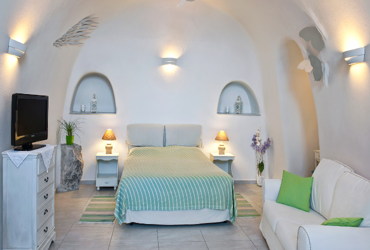 フィラの中心に位置するホテル カバラリは、サントリーニ観光に最適なロケーション。フィラの崖沿いの大通りに位置するので、どこに行くにもわかりやすいホテルとなっています。お部屋はこじんまりとしており価格重視のホテルですが、18室あるホテルの内装はすべて異なっており、中にはサントリーニ島で人気の洞窟スタイルのお部屋もあり、一番下のルームグレードでも、共同テラスからサンセットを楽しむことができます。朝食はお部屋の前のテラスで、数種類のパン、フルーツ、搾りたてのオレンジジュース、濃厚なギリシャヨーグルトなど、ギリシャらしいラインナップとなっています。この立地条件で泊まれるホテルは他にないでしょう!