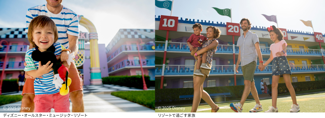 ディズニー・オールスター・リゾートは、スポーツ、音楽(ミュージック)、映画(ムービー)をテーマにした3つからなるディズニー直営ホテルです。オーランド国際空港から車で約30分の距離にあります。1994年にスポーツ・リゾートとミュージック・リゾート、1999年にムービー・リゾートがオープンしました。パークに1番近いのがスポーツ・リゾート、次がミュージック・リゾート、一番奥がムービー・リゾートとなっています。スポーツ・リゾートは野球のベースボールダイアモンドやサーフボードを形どったプールがあり、アメリカンフットボール、バスケットボールなど、アメリカでも人気のあるスポーツをモチーフにしたオブジェが出迎えてくれます。男の子はもちろん、スポーツ好きの大人の方まで楽しめるリゾートです。ミュージック・リゾートは、カントリー、ジャズ、ロックンロール、カリプソ、ブロードウェイスタイルなどの音楽をモチーフに、ギターやグランドピアノの形のプール、ピアノ鍵盤のプールデッキなどが楽しめます。音楽を愛する全ての年代のゲストにおすすめです。ムービー・リゾートには、『ミッキーマウス』などのクラシックなキャラクターモチーフのある『ファンタジア』をテーマとしたプールやダックポンドプール、『マイティダックス』をベースにしたホッケーリンクを形どったプールなどがあり、大きな魔法のほうきや『101匹わんちゃん』のダルメシアンなどのオブジェが楽しいリゾートです。各リゾートは3階建てから4階建てとなり、メインビルにはフードコートとパークへのバス乗り場が完備されています。気軽でカジュアルな料金と雰囲気が人気のリゾートです。