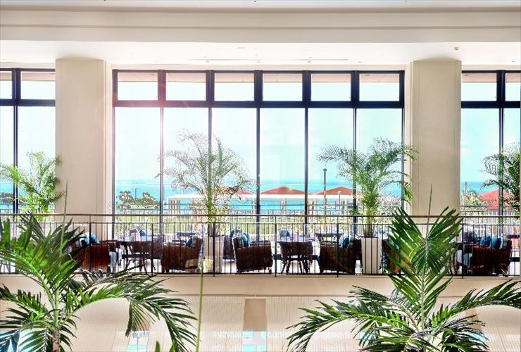 ガーデンプールに面した大きな窓と吹き抜けの店内は開放的な空間です。こだわりの地元食材をふんだんに使用した魅力的なメニューをご堪能下さい。