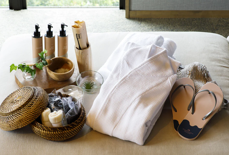 客室はナチュラルで落ち着いた空間に沖縄グリーンで窓からは水平線と読谷の街が広がり、海と空のグラデーションが見え、バルコニーに備え付けられているデイベッドでゆっくりお愉しみ頂けます。