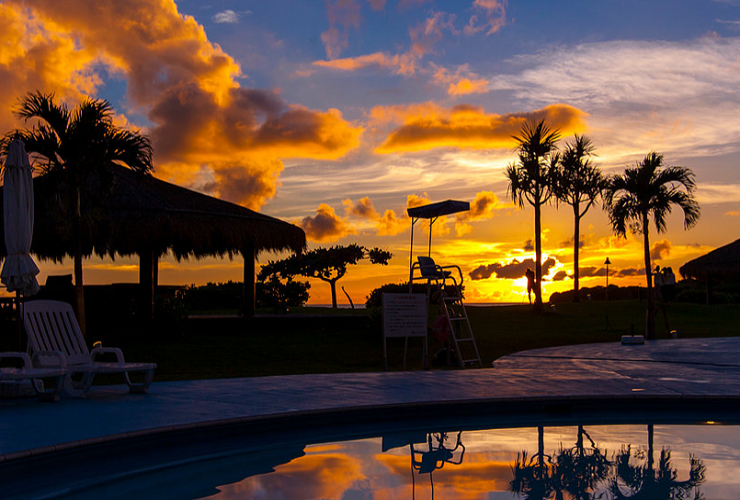 てぃーだ館南側のプールサイドにて、夏季限定のガーデンレストランがオープン。 たのしい南国ビアガーデン。