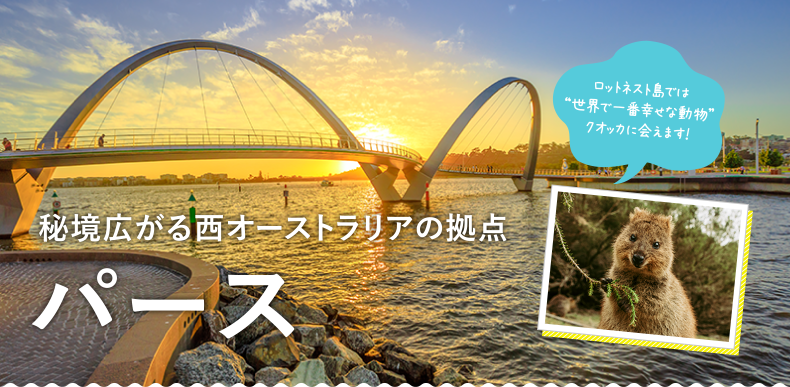 西オーストラリアに位置するパースは自然と都会が調和した街で、「世界で最も美しい街」と言われています。また、ロットネスト島では、西オーストラリア州でしか見ることのできない有袋動物「クオッカ」を見ることができます。コテスロー・ビーチのきれいな海や、緑豊かなキングス・パークを散策したり、スワン・バレーのワイナリーツアーに参加したりと、楽しみ方は様々です。