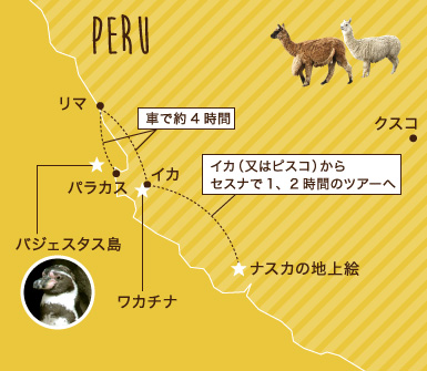 ペルーの玄関口「リマ」は、旧市街(セントロ)が世界遺産に登録されており、歴史的建造物が人々の生活風景と混ざり合い、独特の素晴らしい景観の街です。また、ペルーは海に面し、ジャングル、砂漠も国土に保有する風土豊かな国。リマから日帰りで行ける場所に、全く違う景色が広がっています。 世界遺産「ナスカの地上絵」は、リマから約4時間の「イカ」からセスナで観光へ。砂漠のオアシス「ワカチナ」は同じく「イカ」から車でたったの10分の場所に。野生動物の楽園「バジェスタス島」は、リマから約4時間の「パラカス」という港街からボートに乗って約30分で行くことができます。
