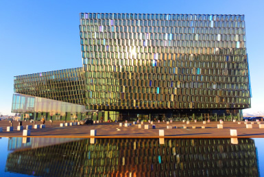 - 2011年5月にオープンし、2013年にはEU現代最優秀建築賞を受賞したコンサートホール「ハルパ」。ユニークな造形は、自然界でマグマが冷え固まって造られる「柱状玄武岩」をイメージして設計されました。四方がガラス張りでできているため、自然光がたっぷりと注ぎこみ、内部に入ると空や海に自然と溶け込んだ様子がよくわかります。アイスランドのエコ精神を感じることができます。4つのメインホールと各種ミーティングルームがあり、11月初旬の音楽フェス「エアーウェイブス」ではメイン会場になります。