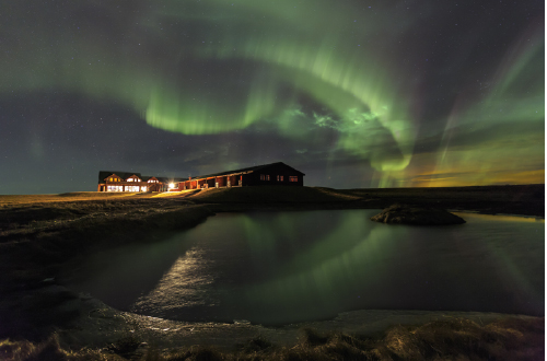 草原と遠くに見上げるヘトラ火山、ホテル周辺には空を遮る木などがなく、街の明かりもなく、オーロラ観賞に絶好の立地です。アイスランドらしい雄大な絶景が広がる中、360度の空を仰いでオーロラの出現を待ちましょう。オーロラが出ていなくとも夜に外にでれば、その澄み切った空気と、澄み渡った美しい空に広がる、満点の星空に驚くことでしょう。見たこともない大きさで輝く星や、流れ星楽しみながら、オーロラを待つ、穏やかで贅沢な時間をお過ごしください。