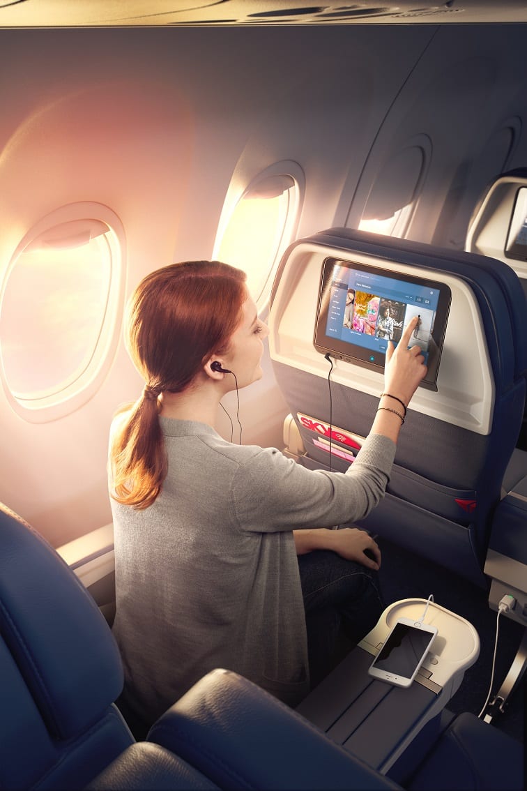 これらに加え、クラス最大級の13.3インチの大型スクリーンを完備。ワイドスクリーンの大きさは、米系航空会社の中でNo.1!大きな画面でお好きなコンテンツプログラムをお楽しみください(スクリーンの大きさは、2019年5月現在のものです)。全クラス共通のサービスとして、機内Wi-Fiのご利用が可能(有料サービス)。お手持ちのノートパソコン、タブレット、スマートフォンなどのすべてのWi-Fi対応機器が対象となっています。さらに、スマートフォンからのテキストメッセージ通信は無料です。デルタ・プレミアムセレクトの座席には、110ボルトの電源コンセントも付いているので、充電の心配は不要です!