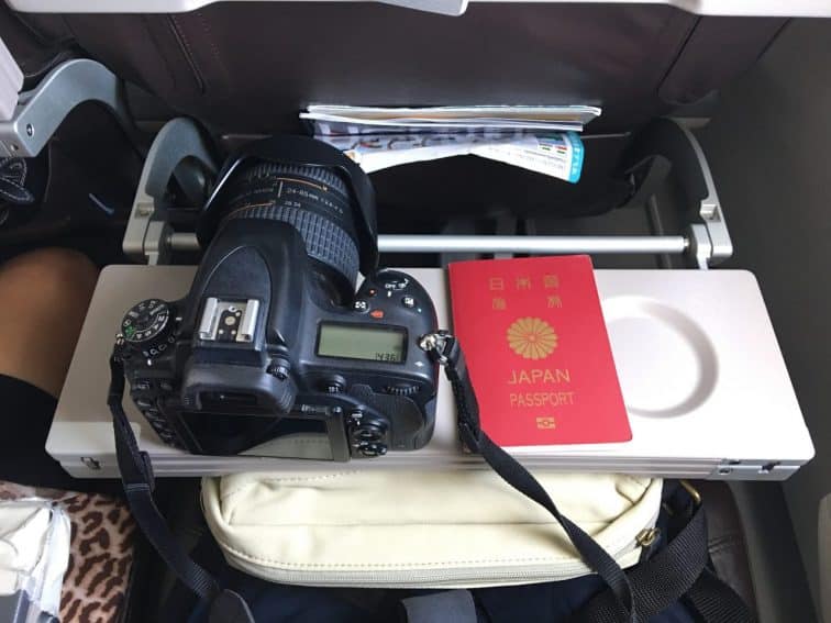 上空で機体が安定しはじめるとともに、前の席の人が無言でシートを全倒ししてきました。前の座席が最大に倒されると、若干の狭さは感じるものの、机を広げて食事をしたりパソコンをするなどの作業には、支障は無いと感じました。写真は、机を半分にした幅でちょうどパスポートサイズ。広げると、倍の幅にになります。