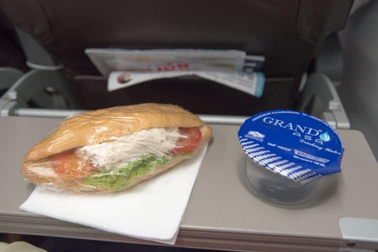 飛行機が離陸して約30分後、機内サービスとして軽食と飲み物が無料で配られます。今回は「サンドイッチ」と「カップに入った水」でした。サンドイッチは冷たく、味は「まあまあ」といったところ。SL301便でこの軽食が配られる時間はお昼頃なので、軽いランチとして嬉しいサービスです。パンの種類や飲み物は、ランダムに変わるそうです。パイやオレンジジュースの時もありますよ。