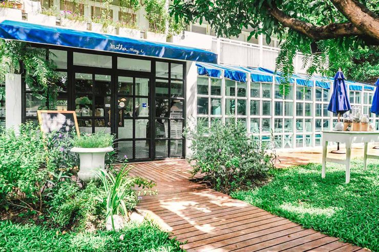BTSトンロー駅から徒歩約5分、豊かな緑に囲まれ佇む一軒家風レストラン「マザー メイ アイ キッチン(Mother May I Kitchen)」。賑やかな駅周辺とは別世界の癒しの空間が広がっています。緑生い茂るトロピカルガーデンを眺められる店内、また屋外にも食事を楽しめる席があります。