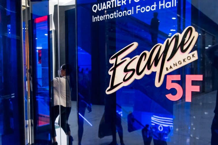 「ESCAPE BANGKOK」は、エムクオーティエという大型ショッピングモールの5階に造られたルーフトップバー&レストランです。エムクオーティエはプロンポン駅直結の高級モール。とはいえ、軒並みにハイブランドショップばかりではなく、ユニクロや紀伊国屋書店なども入っています。プロンポン駅周辺は、多くの日本人が住んでいるエリアなので、現地駐在者や日本人旅行者にとって、とても利用しやすいエリアです。