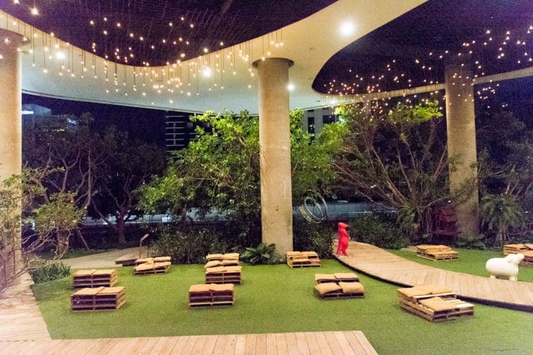橋を渡りきったところに、芝の上でゆっくりと過ごせる広めのガーデンエリアがあります。屋根があるので、万が一雨が降ってしまった時でも安心です。バンコクの大型ショッピングモールには、このような共同スペースが多く造られています。ESCAPE BANGKOKへ行かずとも、昼間にエムクオーティエを訪れた際、子供とのんびり過ごすのにも良いかもしれませんね。