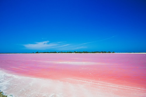 現実とは思えない美しいピンク色の湖「ピンクレイク(またはピンクラグーン)」。カンクンから車で約3時間ほどのリオ・ラガルトスという町にあります。いまや有名になったボリビアのウユニ塩湖と同様、このピンクレイクは「塩田」ですが、プランクトンにより水がピンク色に染まって見えるのです。自然がつくりだした天然のピンク色は、その日の気温、風、太陽の光によって毎回違ったピンク色になります。とくにプランクトンが大量に発生する乾季のピンクラグーンは、鮮やかさが増して絶景です。