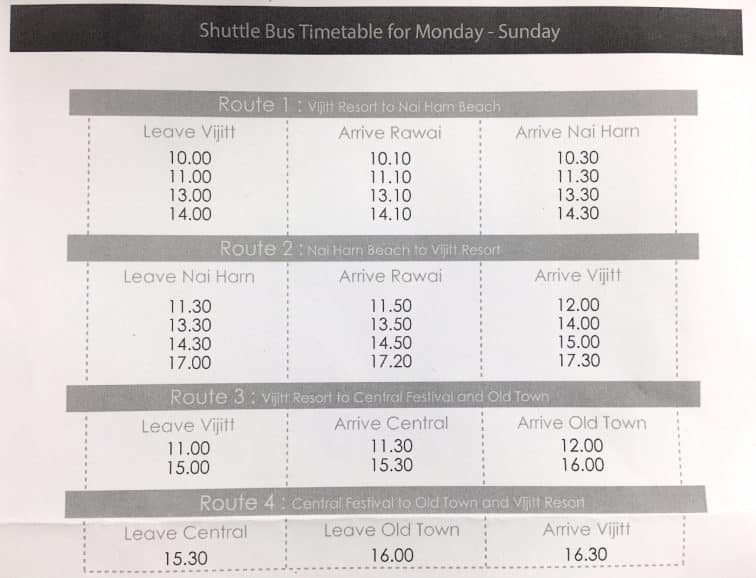 ヴィジット リゾートから、ナイハーンビーチ、ラワイ、セントラル フェスティバル、プーケットオールドタウン、プロンテップ岬までの無料シャトルバスが出ています。主に、ナイハーンビーチ行きと、オールドタウン行きの2つのルート。ナイハーンビーチまでは約30分。オールドタウンまでは約1時間の道のりです。ナイハーンビーチは、プーケットのなかでも非常に海水の透明度が高いことでも知られています。