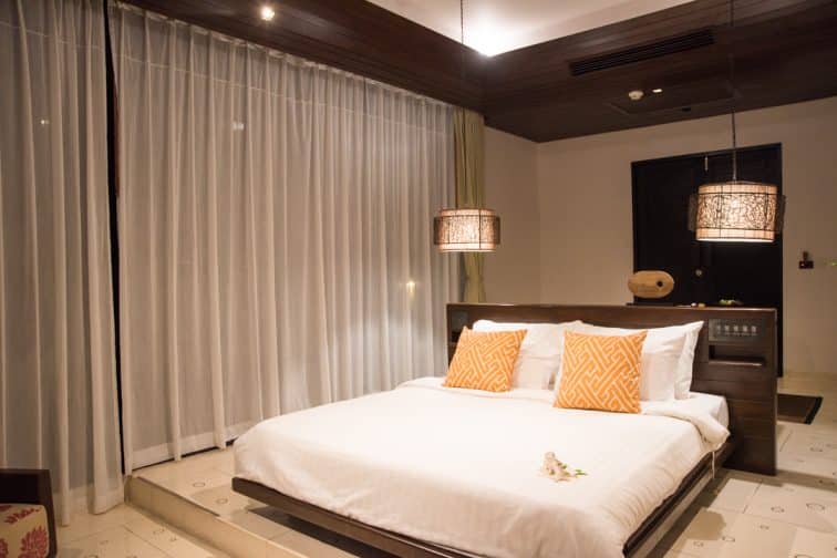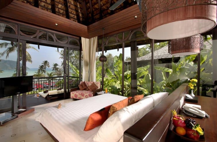木材やタイルを使ったヴィラは、タイの伝統的な雰囲気を残したままのつくりです。となりのヴィラとは近すぎず、一定のほどよい距離が保たれており、人目を気にせずリラックスできるように配慮されています。客室の天井は高く正方形の間取りで、明るく開放的な空間です。窓も大きく、ベッドに横になれば、室内にいながらも目の前に広がるプーケットの美しい景色を楽しめます。