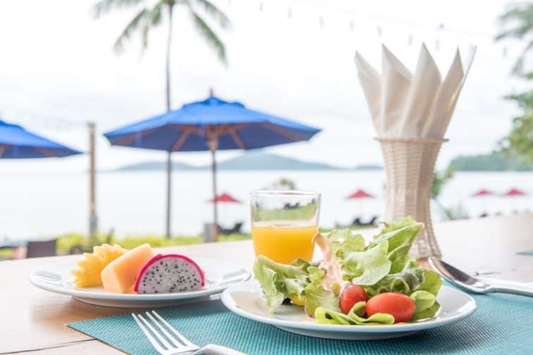 ヴィジットリゾートの朝食(フルーツとサラダとオレンジジュース)