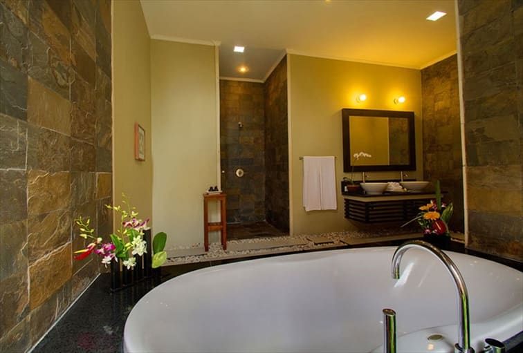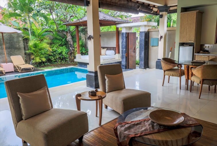 全室プライベートプール付きで、ダイニングエリアとキッチンのある広々としたリビングに天蓋付きのベッドルーム、ダブルシンクとバスタブ、スパベッドが備わったバスルームがさらにラグジュアリーな気分を高めてくれます。バスルームからも直接プールにアクセスできる構造となっており、南国らしい茅葺き屋根や、バリ風インテリア雑貨、クオリティの高い木の家具、プールサイドにはバリ風の東屋も備わり、バリリゾートの雰囲気あふれるインテリアデザインです。